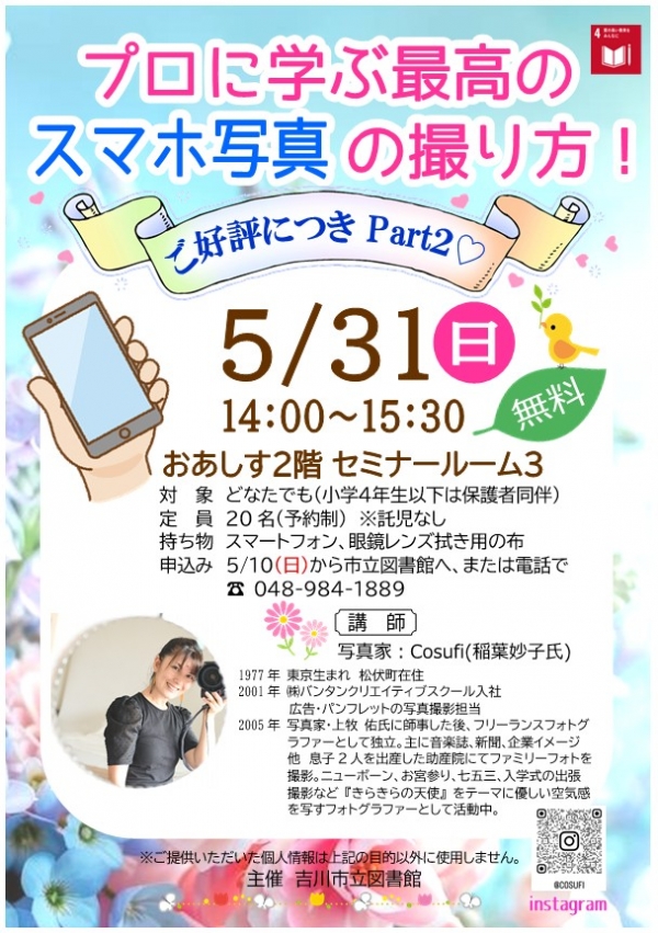 申込み:5月10日(日)から吉川市立図書館へ直接、または電話で