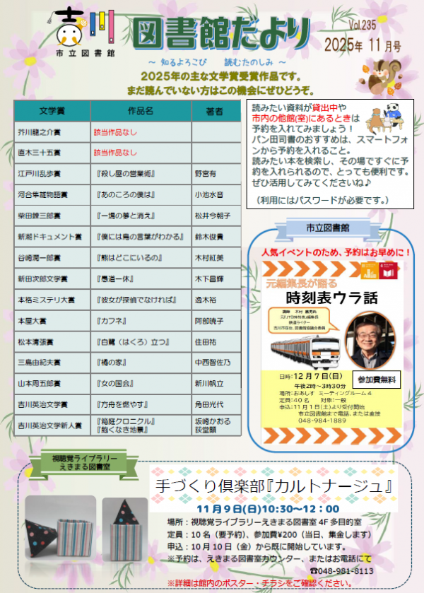 今回の図書館だよりでは、2025年の主な文学賞受賞作品を掲載しましたので、まだ読んでいない方は、この機会にぜひどうぞ。