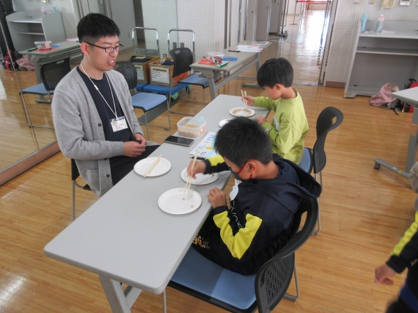 今年もTOSS埼玉の皆さんを講師にお迎えして開催しました。「洗面器お手玉投げ」、「豆つまみ皿うつし」、「紙ちぎり」、「割りばしダーツ」など全7種目にチャレンジして遊びました。各種目のチャンピオンになろう、記録を伸ばそうと何度もチャレンジし、新記録を更新するとみんな声をあげて喜んでいました。